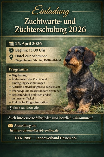 Die vom DTK genehmigten hessischen Terminmeldungen, hier von Zuchtschauen, von Wettbewerben im Juniorhandling und den Gebrauchsprüfungen (Jagd und BHP) erscheinen im "Terminkalender" auf der rechten Seite unserer Homepage.